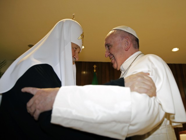 «محبت نیوز»- پاپ فرانسیس، رهبر کاتولیکهای جهان و «کریل یکم»، اسقف کلیسای ارتدکس روسیه، برای اولین بار از زمان «جدایی شرق و غرب» در سال ۱۰۵۴ میلادی که مسیحیت را به دو دسته غربی و شرقی تقسیم کرد، در سال ۲۰۱۶ در کوبا با یکدیگر دیدار کردند.