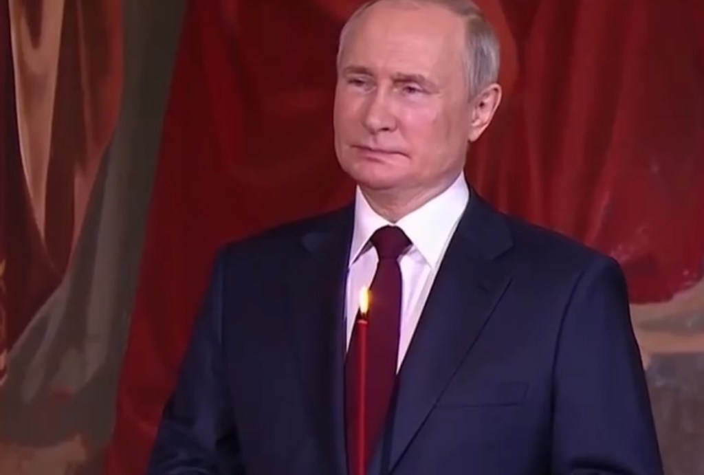پوتین در “کلیسای جامع عیسی نجاتدهنده” در مسکو با در دست داشتن یک شمع قرمز روشن ایستاده است.