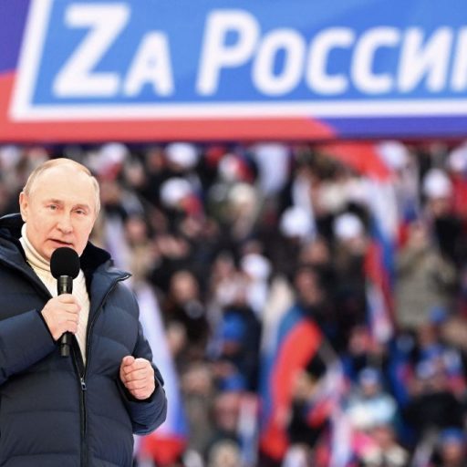 ولادیمیر پوتین در مراسمی به مناسبت هشتمین سالگرد الحاق کریمه به روسیه، در ورزشگاه لوژنیکی مسکو با استناد…